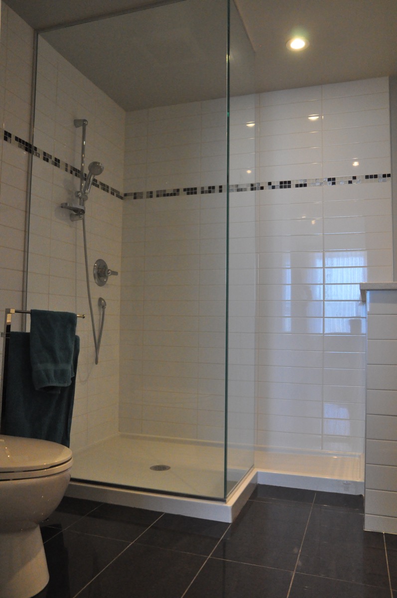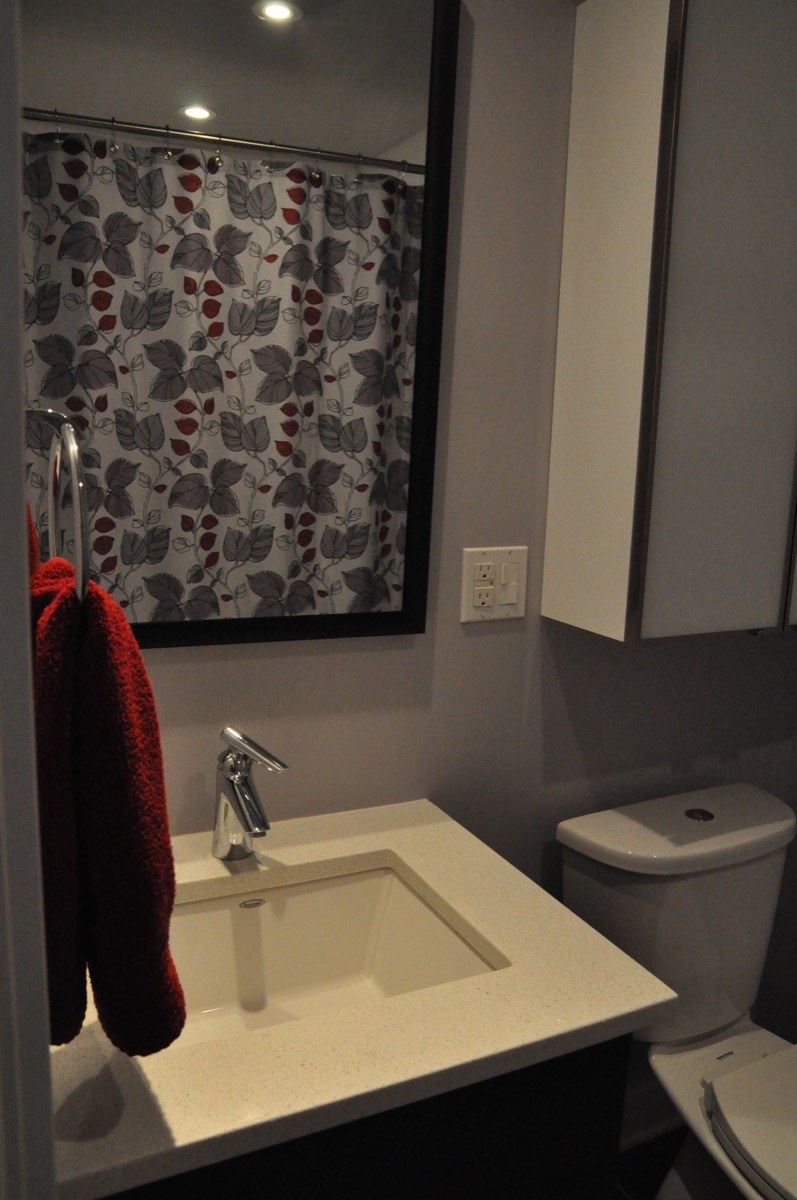 La salle de toilette (lavage et toilette) a été fusionnée avec le garde-manger pour permettre d'ajouter une douche et une vanité ! Un grand défi pour une aussi petite pièce !
