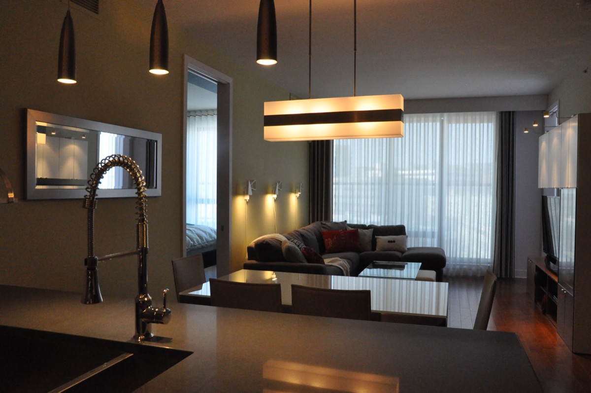 Réaménagement complet du rez-de-chaussée de cette résidence. La cuisine a été décloisonnée pour permettre une bonne circulation avec les autres pièces et la miniature salle de bain a été déplacée dans la plus petite des chambres pour répondre aux besoins de la famille.